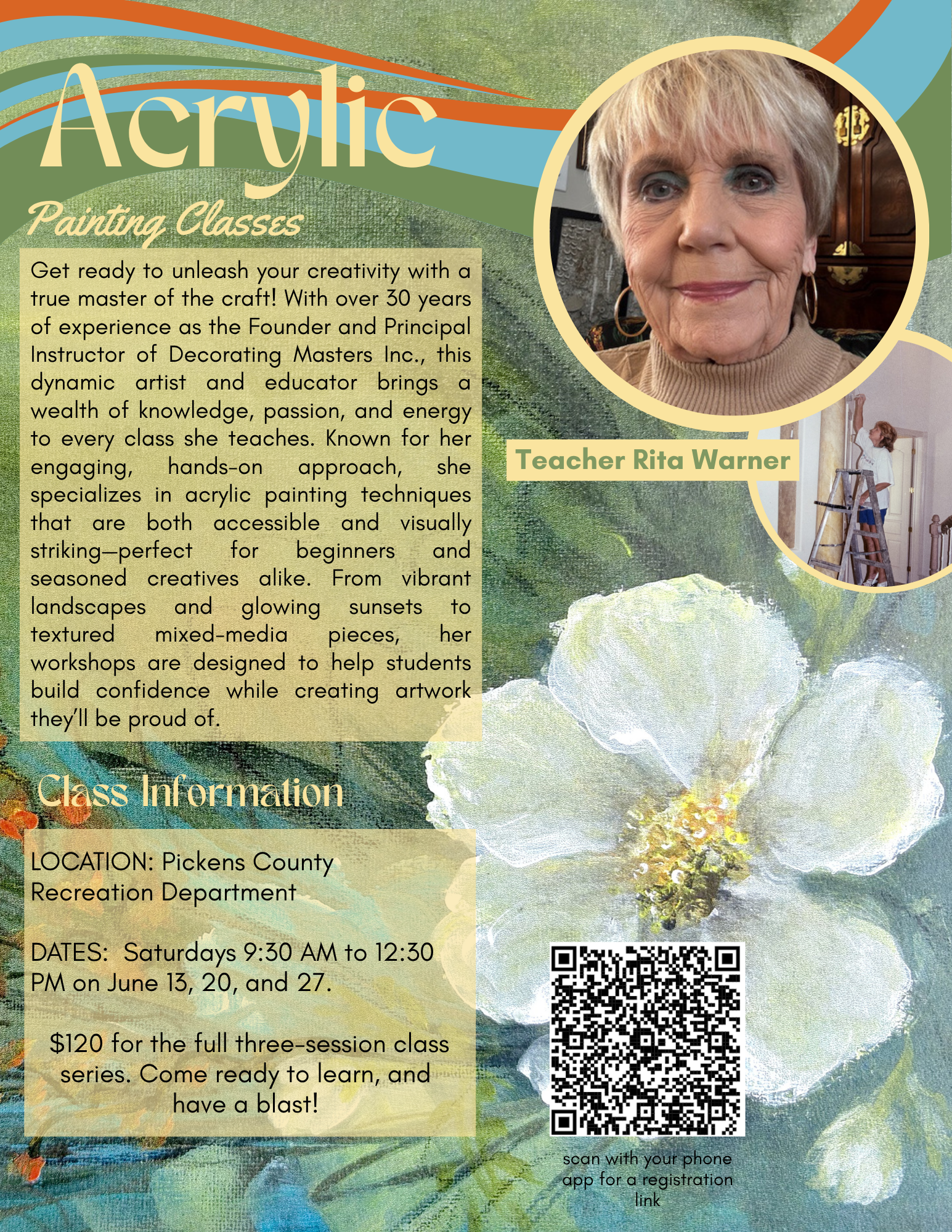 Unleash your creativity in this hands-on acrylic painting workshop led by a seasoned professional with over 30 years of experience as the Founder and Principal Instructor of Decorating Masters Inc. This engaging three-session class is perfect for beginners and experienced artists alike, offering step-by-step guidance in creating vibrant, eye-catching artwork.